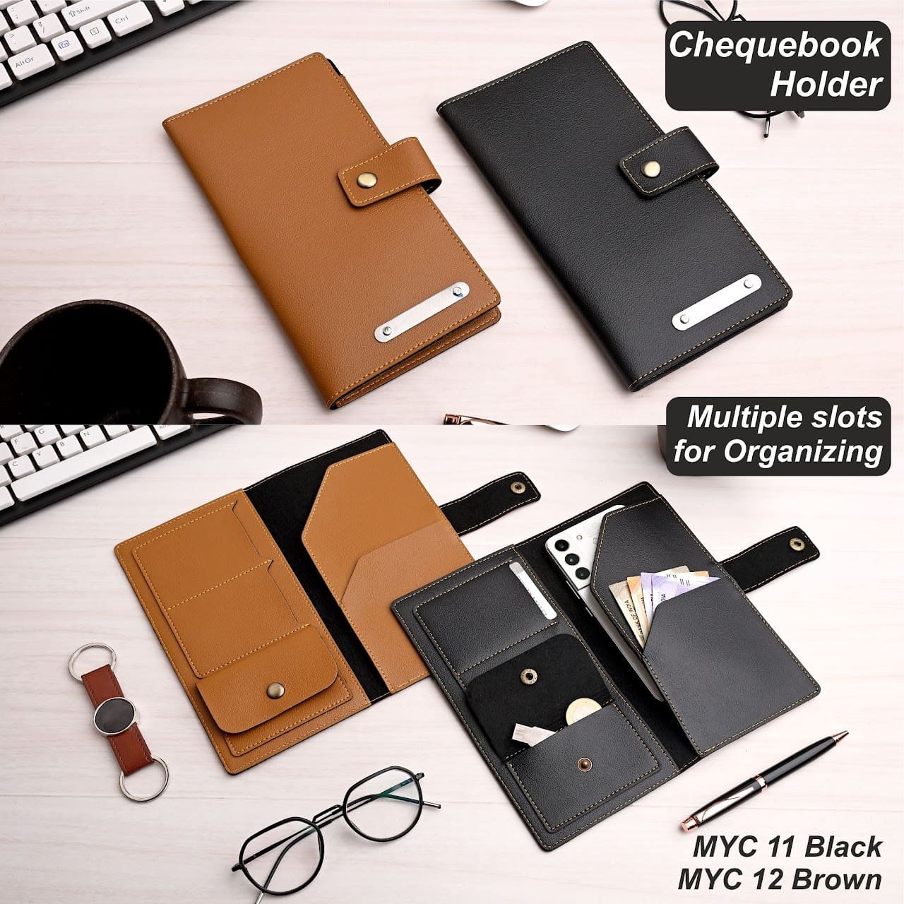 Keep your financial essentials organized with our Premium Leather Chequebook Holder, a stylish blend of professionalism and practicality. Crafted with durable PU leather, it is designed to securely store your chequebook while also accommodating cards, cash, coins, and even a mobile phone.